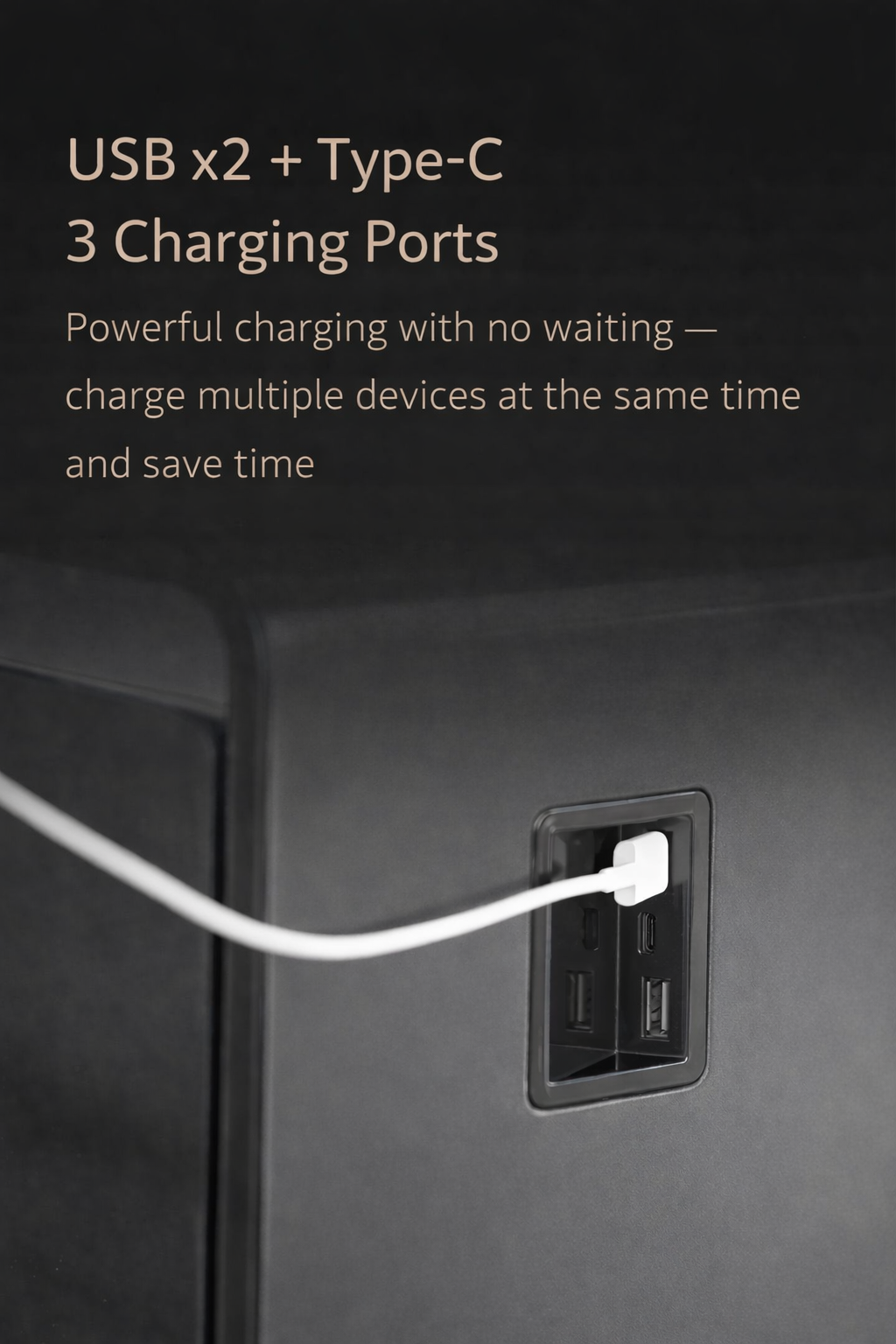 The table allows wireless charging in the dedicated area and can also accommodate other devices via its integrated ports (depending on configuration).
